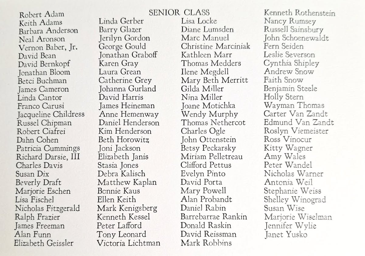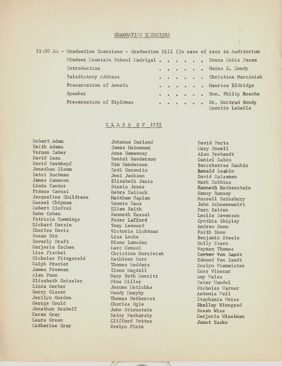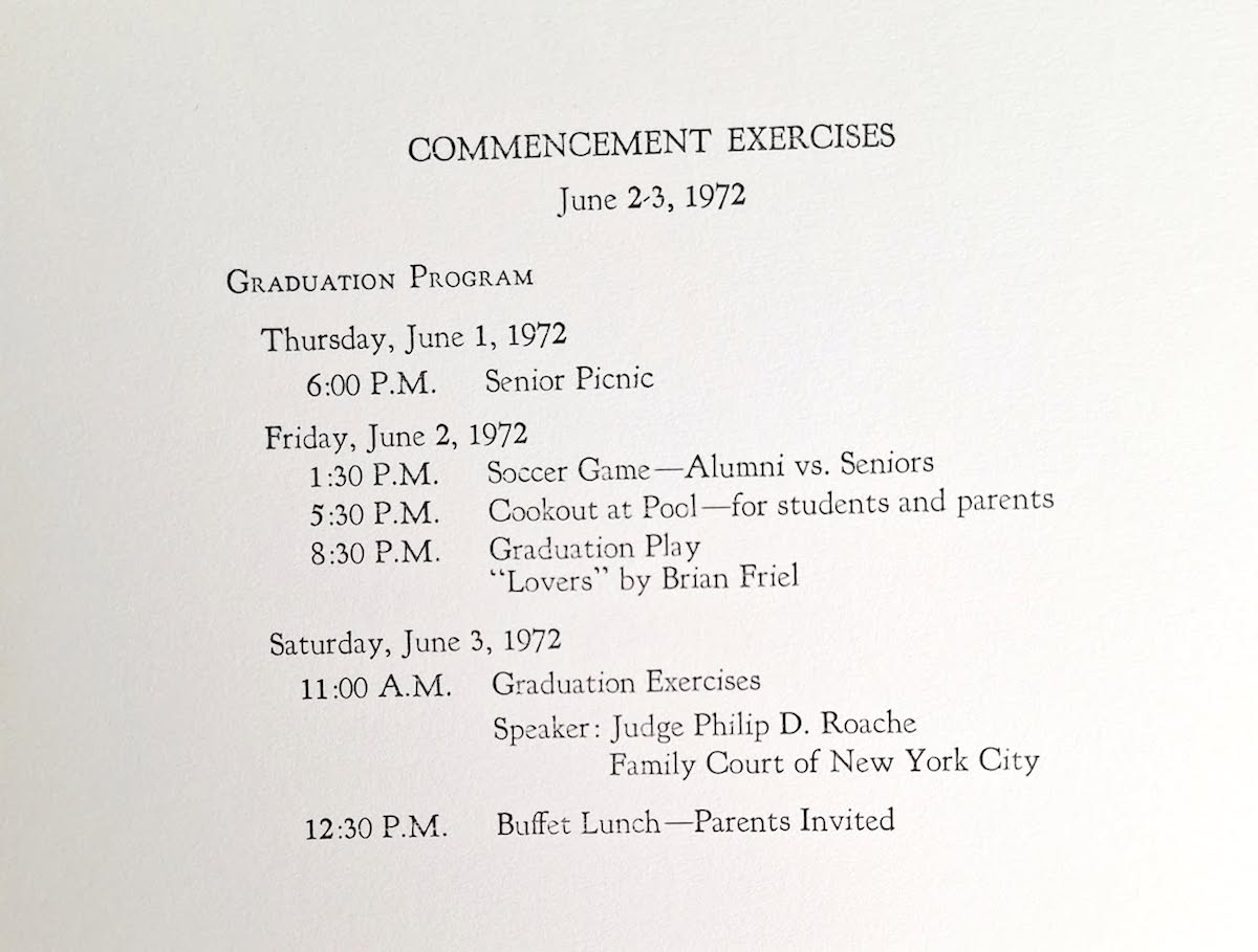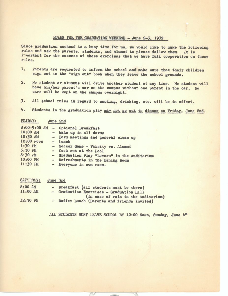 Windsor may not have been a traditional school, but it took Graduation seriously with a three day Commencement event usually in the first week of June. Formal Invitations were sent out, printed letterpress on 4 x 6″ fold-over white card. Beginning Thursday there was a Senior Picnic at 6 PM, then on Friday a Soccer Game, Cookout by the pool followed by a play at the Theater. On Saturday the Graduation began at 11 am that often included well known guest speakers … in 1974 it was Alger Hiss, ending with a buffet lunch – here is a copy of the “Rules” (click here). Your curator has only a few scanned copies of the invitations, play programs, and related items here. To see a complete 1970 set (click here).