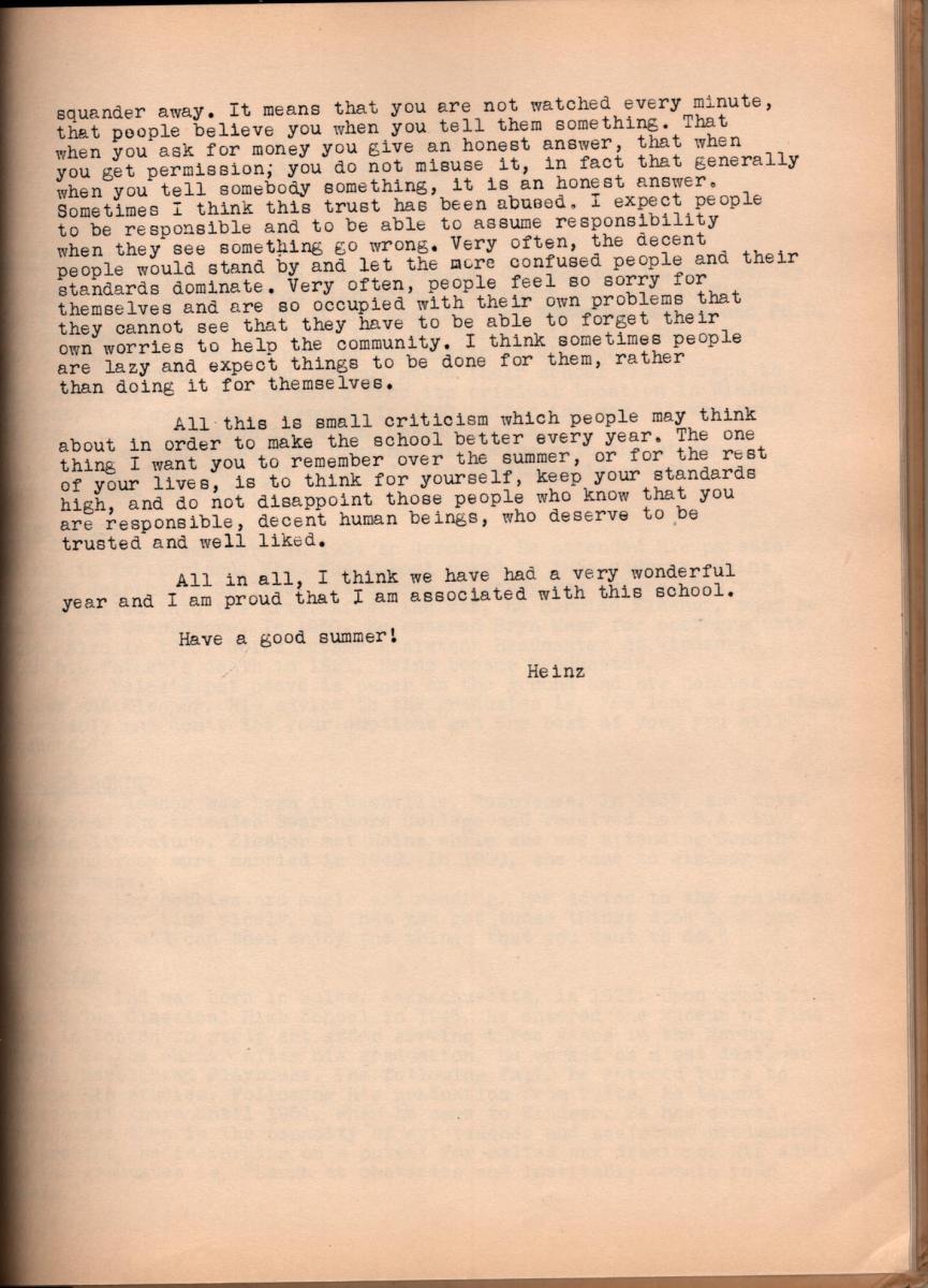 A traditional style yearbook, approximately 100 pages (printed one side), 8.5 x 11, with mimeographed pages (done at WMS) mixed with photo pages on coated 80 lb white, hardbound (glued pages to cloth fly sheet), cover is silk screen printed on laminated board. The beginning of book tells the history of the school by Gertrud, followed by a “Campus” overview and a lengthy report from Heniz. The faculty (first name and last names) follows, with a brief statement about each of them. There is a large section on sports (Heniz coached soccer). Seniors section near the end includes a “will” to the future, followed by numerous pages of advertisers (not included) and lastly a list of addresses and phone numbers so alum can stay connected (a nice addition).