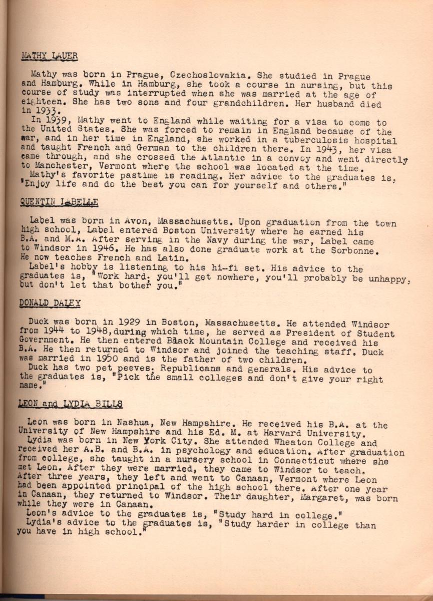 Highlights: The book is dedicated to Mathy Lauer – a cousin to Gertrud, who, like her, was one of the first women doctors in Germany (learn more about her in AnneMarie Bondy Roeper’s book “Marienau). Maurice Eldridge was Student Council President, find his words of wisdom on page 45. There are many photo pages, oddly there are many pages dedicated to sports from tennis to field hockey, a few daily scene pages, and as usual, Franny Hall did several theater productions – keep in mind the Theater has not yet been built, nor has West or East Dorms.