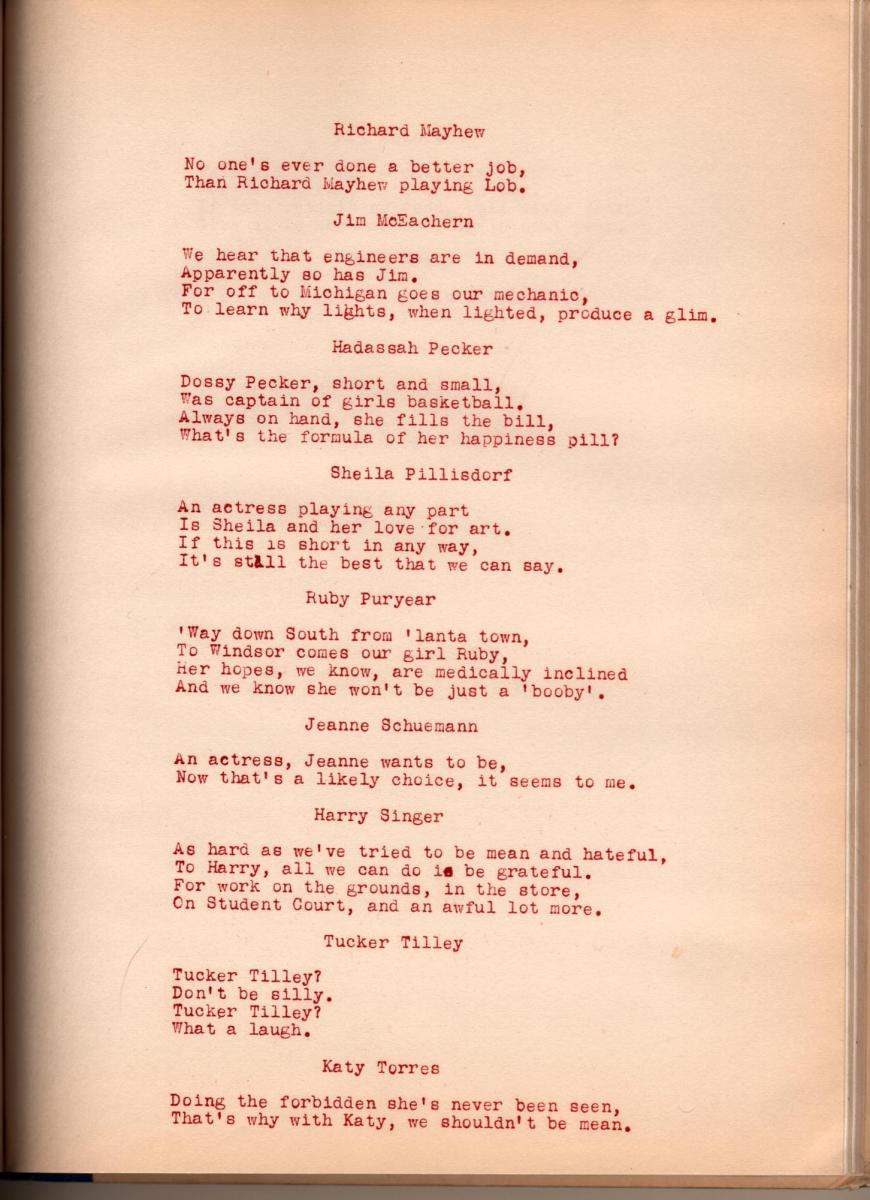 Highlights: The book is dedicated to Mathy Lauer – a cousin to Gertrud, who, like her, was one of the first women doctors in Germany (learn more about her in AnneMarie Bondy Roeper’s book “Marienau). Maurice Eldridge was Student Council President, find his words of wisdom on page 45. There are many photo pages, oddly there are many pages dedicated to sports from tennis to field hockey, a few daily scene pages, and as usual, Franny Hall did several theater productions – keep in mind the Theater has not yet been built, nor has West or East Dorms.