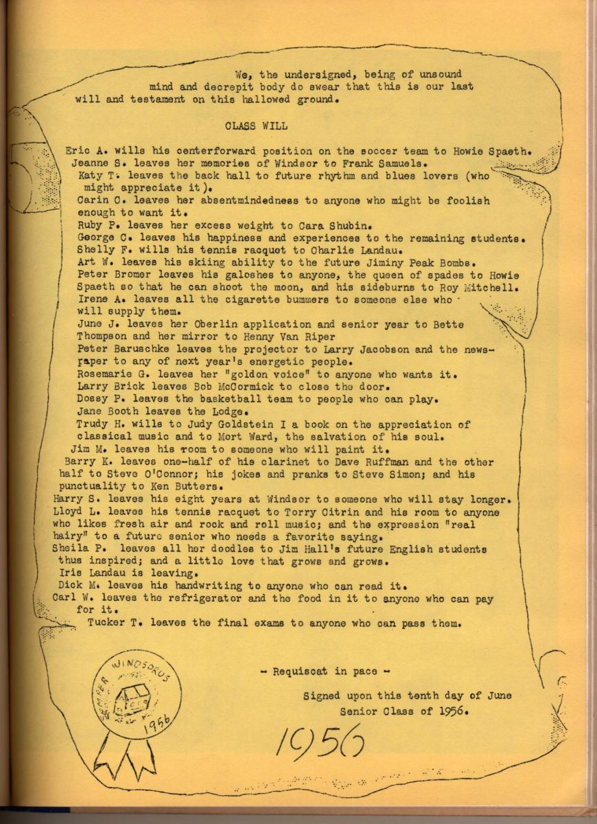 A traditional style yearbook, approximately 100 pages (printed one side), 8.5 x 11, with mimeographed pages (done at WMS) mixed with photo pages on coated 80 lb white, hardbound (glued pages to cloth fly sheet), cover is silk screen printed on laminated board. The beginning of book tells the history of the school by Gertrud, followed by a “Campus” overview and a lengthy report from Heniz. The faculty (first name and last names) follows, with a brief statement about each of them. There is a large section on sports (Heniz coached soccer). Seniors section near the end includes a “will” to the future, followed by numerous pages of advertisers (not included) and lastly a list of addresses and phone numbers so alum can stay connected (a nice addition).