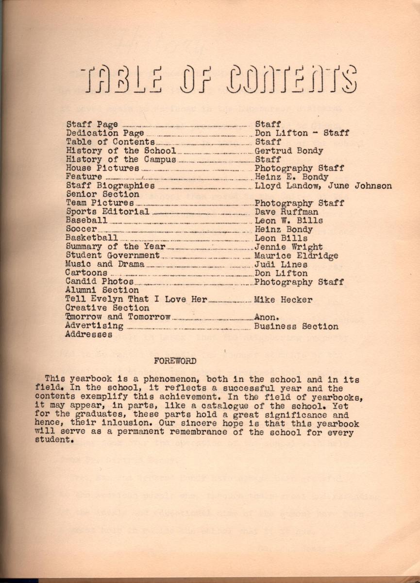A traditional style yearbook, approximately 100 pages (printed one side), 8.5 x 11, with mimeographed pages (done at WMS) mixed with photo pages on coated 80 lb white, hardbound (glued pages to cloth fly sheet), cover is silk screen printed on laminated board. The beginning of book tells the history of the school by Gertrud, followed by a “Campus” overview and a lengthy report from Heniz. The faculty (first name and last names) follows, with a brief statement about each of them. There is a large section on sports (Heniz coached soccer). Seniors section near the end includes a “will” to the future, followed by numerous pages of advertisers (not included) and lastly a list of addresses and phone numbers so alum can stay connected (a nice addition).