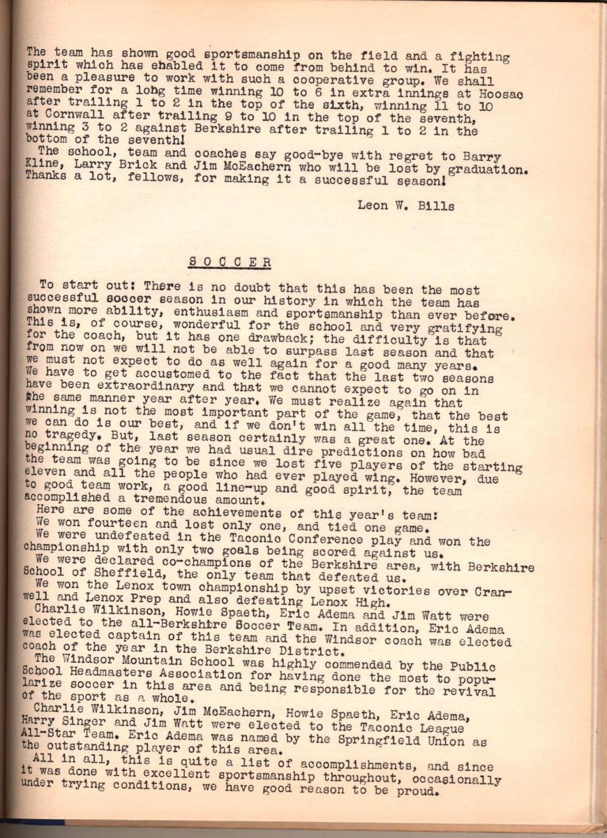 A traditional style yearbook, approximately 100 pages (printed one side), 8.5 x 11, with mimeographed pages (done at WMS) mixed with photo pages on coated 80 lb white, hardbound (glued pages to cloth fly sheet), cover is silk screen printed on laminated board. The beginning of book tells the history of the school by Gertrud, followed by a “Campus” overview and a lengthy report from Heniz. The faculty (first name and last names) follows, with a brief statement about each of them. There is a large section on sports (Heniz coached soccer). Seniors section near the end includes a “will” to the future, followed by numerous pages of advertisers (not included) and lastly a list of addresses and phone numbers so alum can stay connected (a nice addition).
