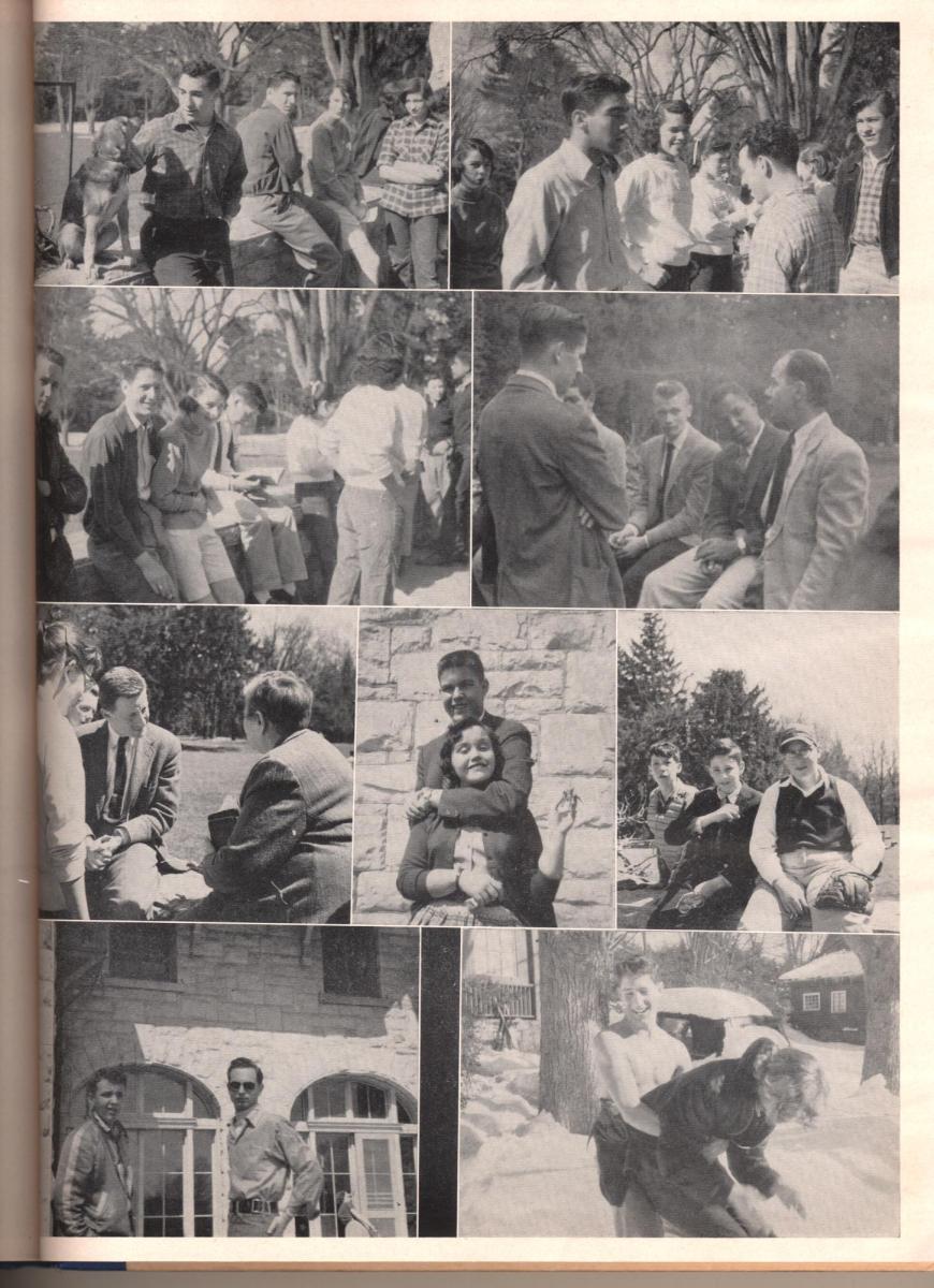 A traditional style yearbook, approximately 100 pages (printed one side), 8.5 x 11, with mimeographed pages (done at WMS) mixed with photo pages on coated 80 lb white, hardbound (glued pages to cloth fly sheet), cover is silk screen printed on laminated board. The beginning of book tells the history of the school by Gertrud, followed by a “Campus” overview and a lengthy report from Heniz. The faculty (first name and last names) follows, with a brief statement about each of them. There is a large section on sports (Heniz coached soccer). Seniors section near the end includes a “will” to the future, followed by numerous pages of advertisers (not included) and lastly a list of addresses and phone numbers so alum can stay connected (a nice addition).