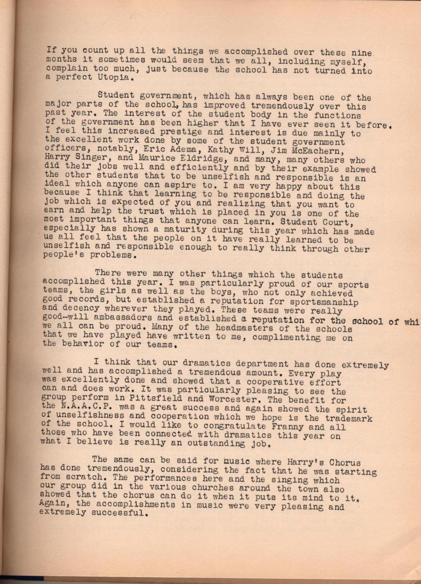 Highlights: The book is dedicated to Mathy Lauer – a cousin to Gertrud, who, like her, was one of the first women doctors in Germany (learn more about her in AnneMarie Bondy Roeper’s book “Marienau). Maurice Eldridge was Student Council President, find his words of wisdom on page 45. There are many photo pages, oddly there are many pages dedicated to sports from tennis to field hockey, a few daily scene pages, and as usual, Franny Hall did several theater productions – keep in mind the Theater has not yet been built, nor has West or East Dorms.