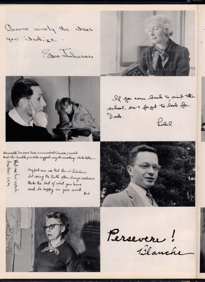 Highlights: Gertrud’s “Orgins” and school history are worth reading). Heinz still very young to be Headmaster, writes that the future of the school is to remain small, thus reducing to about 150 students (10 students less). He has a wish list for a dining room, a stage, and new girls dorm. He tells students not to be afraid of being called an egghead, a longhair, or and intellectual … to resist the lure of the crowd and stand up for what he [she] believes.