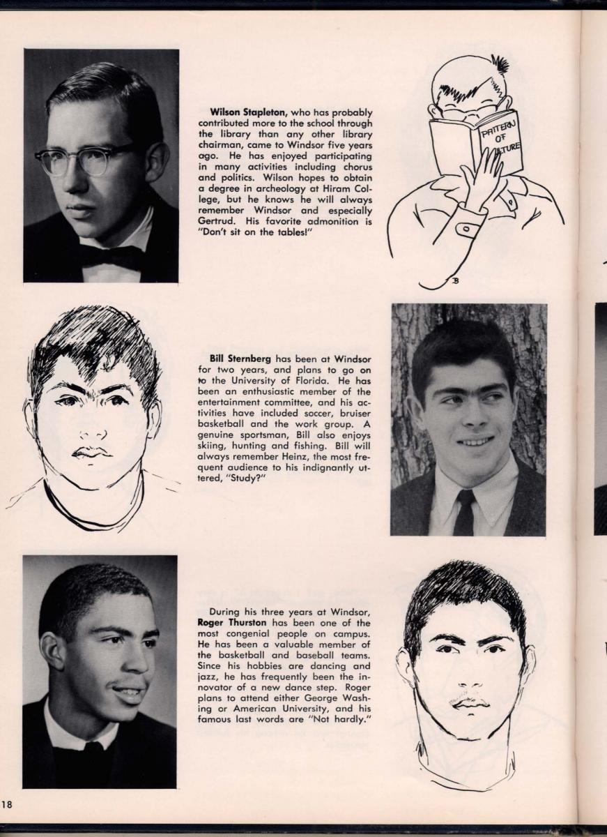 A traditional style yearbook, approximately 80 pages, 8.5 x 11 on coated 80 lb white, with hardbound (sewn signature) dark blue cloth cover that is silk screen printed with white ink. The beginning of book tells the story of the school and features the faculty (first name only – the Windsor tradition) each handwriting a message. Seniors are listed near the front with pen sketches, including an 8th grade “Commencment” and “Graduation” (with Senior Prom). There are poems, Valedictory speech, followed by sponsors and numerous pages of advertisers (not included). There is no mention of Student Council, but there are (for some reason) baby pictures.