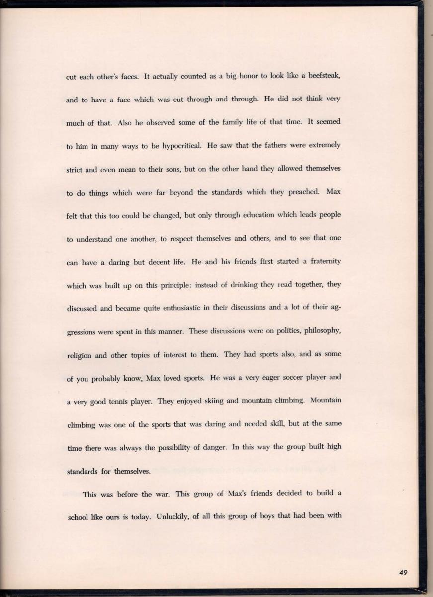 Highlights: Gertrud’s “Orgins” and school history are worth reading). Heinz still very young to be Headmaster, writes that the future of the school is to remain small, thus reducing to about 150 students (10 students less). He has a wish list for a dining room, a stage, and new girls dorm. He tells students not to be afraid of being called an egghead, a longhair, or and intellectual … to resist the lure of the crowd and stand up for what he [she] believes.