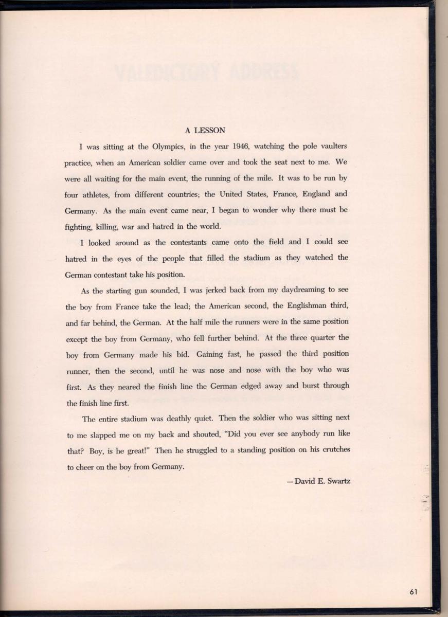 Highlights: Gertrud’s “Orgins” and school history are worth reading). Heinz still very young to be Headmaster, writes that the future of the school is to remain small, thus reducing to about 150 students (10 students less). He has a wish list for a dining room, a stage, and new girls dorm. He tells students not to be afraid of being called an egghead, a longhair, or and intellectual … to resist the lure of the crowd and stand up for what he [she] believes.