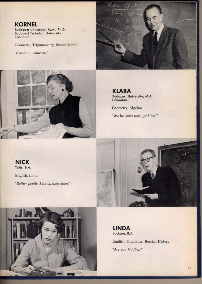 Highlights: Bill KaDell was Student Council President, and his words of wisdom and gift to the future (last page) are par for Bill. The school history is a good read, as are the three pages of Gertrud’s “Realizations” and “The Result” (pg 54). The school was always small, and in 1960 it was 100+ (growing to 400+ in 1970), and the yearbook features dorm group pictures. There are loads of photos, oddly there are many pages dedicated to sports from tennis to field hockey, even music, and with Franny Hall, several theater productions – keep in mind the Theater has not yet been built.