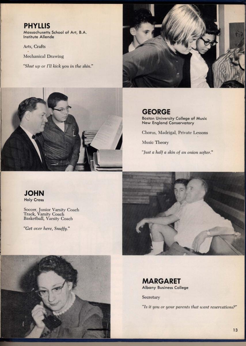 Highlights: Bill KaDell was Student Council President, and his words of wisdom and gift to the future (last page) are par for Bill. The school history is a good read, as are the three pages of Gertrud’s “Realizations” and “The Result” (pg 54). The school was always small, and in 1960 it was 100+ (growing to 400+ in 1970), and the yearbook features dorm group pictures. There are loads of photos, oddly there are many pages dedicated to sports from tennis to field hockey, even music, and with Franny Hall, several theater productions – keep in mind the Theater has not yet been built.