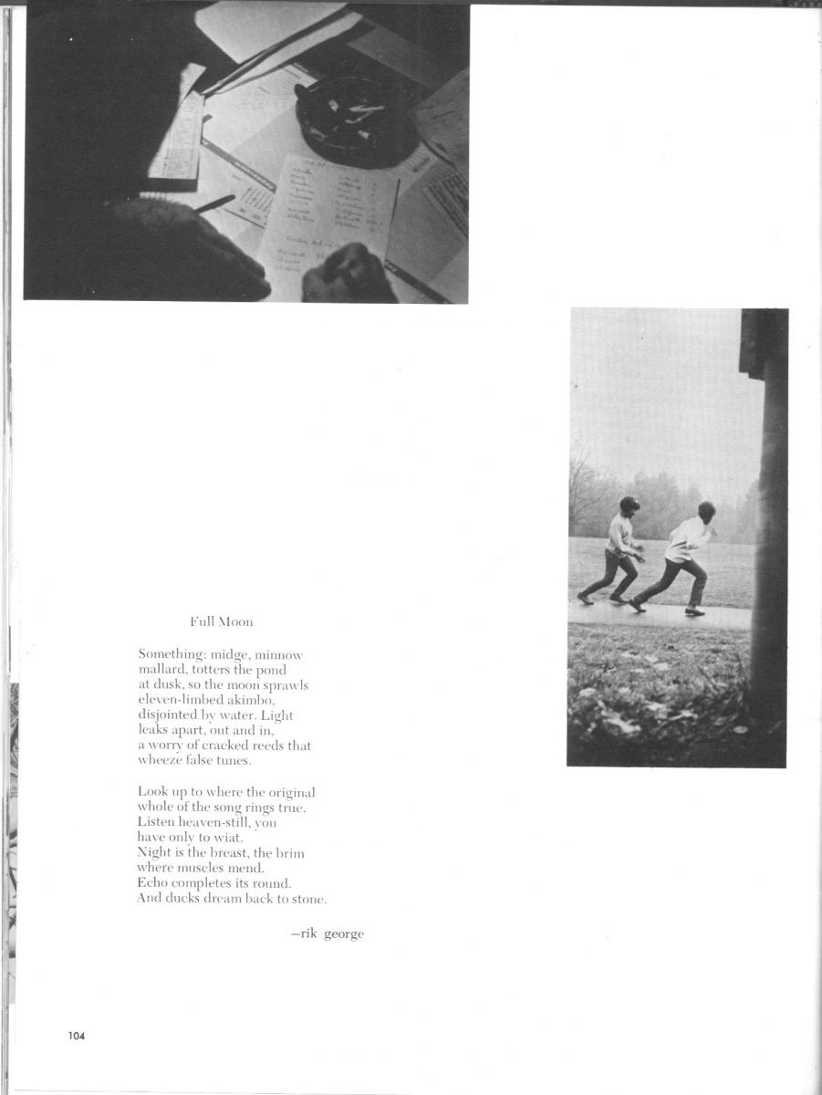 A traditional style yearbook, approximately 120 pages, 8.5 x 11 on matte coated 80 lb white, with hardbound (sewn signature) Purple linen cloth cover that is Hot stamped on front only with Silver foil. Find credits given to the Yearbook committee on page 118. No message from Gertrude … she has not contributed to any Yearbook since 1960 for reasons unknown. Heinz takes over providing the annual message on page 4 titled “The Future of Windsor” signed in all lower case “heinz e. bondy.” Heinz worries … “Windsor, with the help from its students, must find a solution to the unhappiness, dissatisfaction, and alienation from the “real” world which [is] more pronounced and wide-spread than ever before.” Very little other text … mostly student and other poems. In this year there were numerous photographers, but photos are not identified. Faculty is featured first, Seniors come next (because this is Roger Barth book, there many salutations), activities and sports get sprinkled between sections, Dorm Photos (no captions), Student Council/Court, Yearbook Committee and sponsors.